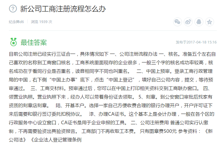目前公司注冊已經實行三證合一,具體情況如下 一、公司注冊流程辦法 一、核名。準備五個左右自己喜歡的名稱到工商窗口核名,工商系統里面現存的企業很多,一般三個字的核名成功率較高,核名成功在于看同行業是否重名,讀音相同字不同也叫重名。 二、中國上預審。登錄工商行政管理局的中國,右下側“中國上辦事”底下,點擊“中國上登記”,填好自己公司內容,提交,等待預審通過。 三、工商交材料。預審通過后,您可以在中國上打印相關資料交到工商聯辦窗口。 四、領營業執照。營業執照下來,經辦人可以帶著身份證去領取。 5、刻章。到公安窗口審批后找家有資質的刻章店刻章。 陸、開基本戶。選擇一家自己方便收費合理的銀行辦理開戶,開戶許可證下來后需要和銀行簽訂委托扣稅協議。 漆、辦理CA證書。這個基本上是會計辦理,一般在各個區的行政服務中心設立窗口,CA證書是用于企業申報的工具。 二、公司注冊費用 普通公司實行認繳制,不再需要驗資出具驗資報告。 工商部門不再收取工本費。 只有圖章費500元
