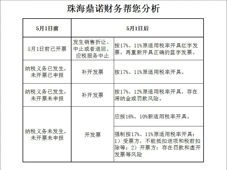 原則:凡是納稅義務(wù)發(fā)生時(shí)間在5月1日之前的,一律適用原17%、11%的稅率納稅,按照原稅率開(kāi)具發(fā)票;若納稅義務(wù)發(fā)生時(shí)間在5月1日之后的,則適用調(diào)整后的16%、10%的新稅率納稅,按照新稅率開(kāi)具發(fā)票。