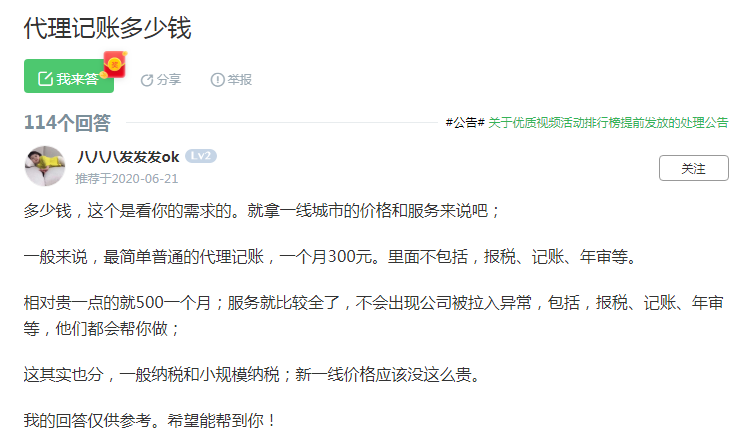 相對貴一點的就500一個月;服務就比較全了,不會出現公司被拉入異常,包括,報稅、記賬、年審等,他們都會幫你做;